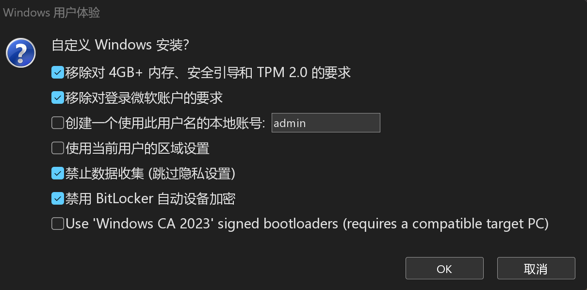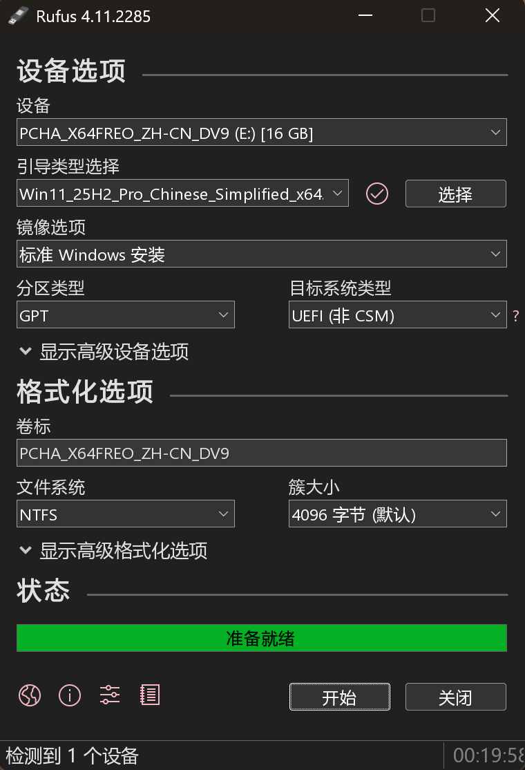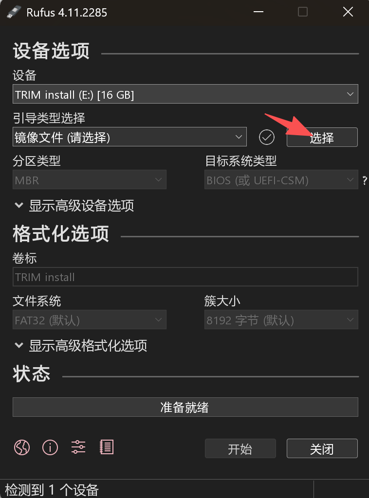 插入U盘,双击打开 rufus,选择下载好的windows镜像,直接点开始