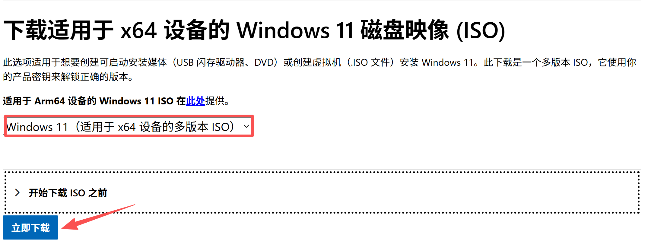 版本可选择:Windows 11 (适用于 x64 设备的多版本ISO)、Windows 11 专业中文版,不建议选择家庭版
